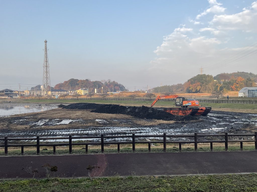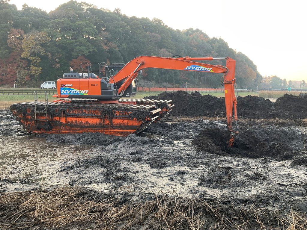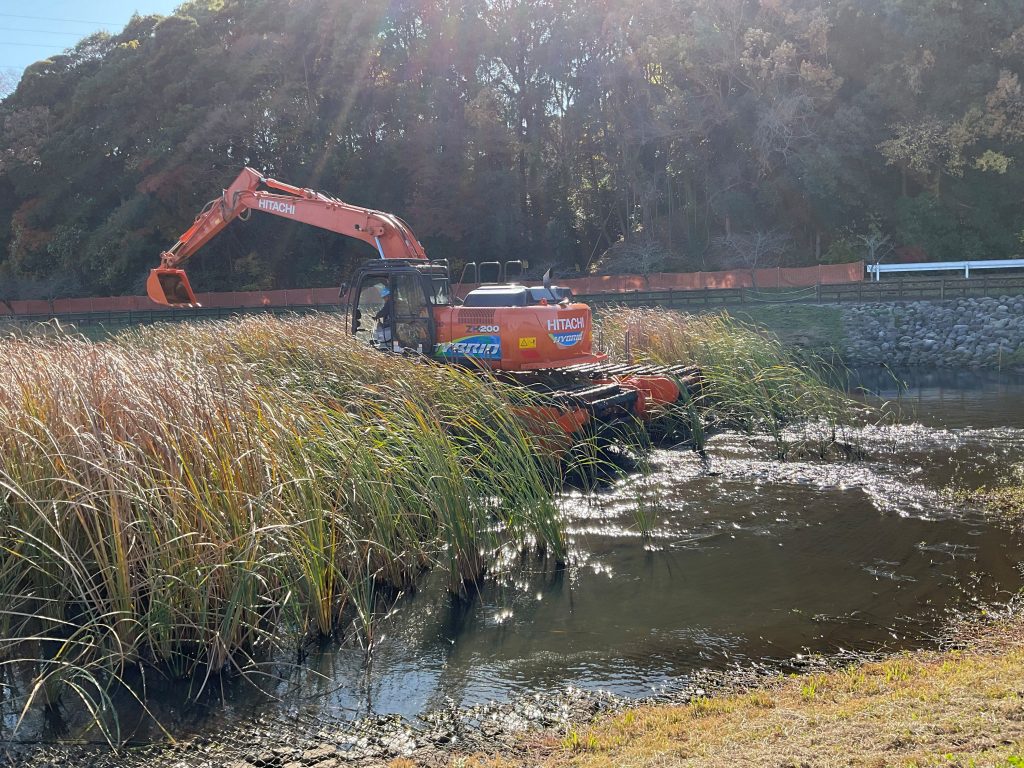 池の中の泥や蝦蟇の穂を搬出する工事にあたり